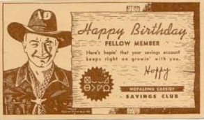 jackpot. By 1950 Hopalong Cassidy was everywhere: radio, television, comics, newspapers, magazines, records, toys, candy, cookies, books, hair tonic and believe it or not the first children's lunch box to show a picture. Hoppy mania was wide spread, the market was flooded, and demand was overwhelming. Bill also started a juvenile club called "Hoppys Troopers" whose overall membership rivaled that of the Boy Scouts. William Boyd retired his guns In 1953, but still continued to rake in the royalties until the late 1950's when he sold the rights to the character. | |||